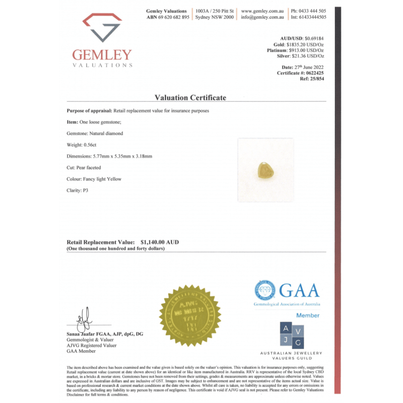 0.56CT NATURAL FANCY YELLOW DIAMOND Pear Faceted Cut, Fancy Light Yellow, P3 Clarity, Loose, Unset. Valuations Provided by an Independent Third-Party Professional Not Directly Associated With Lloyds Auctions at AUD $$1,140.00This valuation has been conducted by an independent third-party professional. The valuation amount is an assessment by the issuing valuer and does not reflect the auction value of the item. Any inquiries regarding the valuation should be directed to the issuing valuer (refer to contact details on the certificate), as Lloyds Auctions has no affiliation or influence over the valuation, the valuer, or the stated amount. Condition: Good - Refer Images 0645966+2234