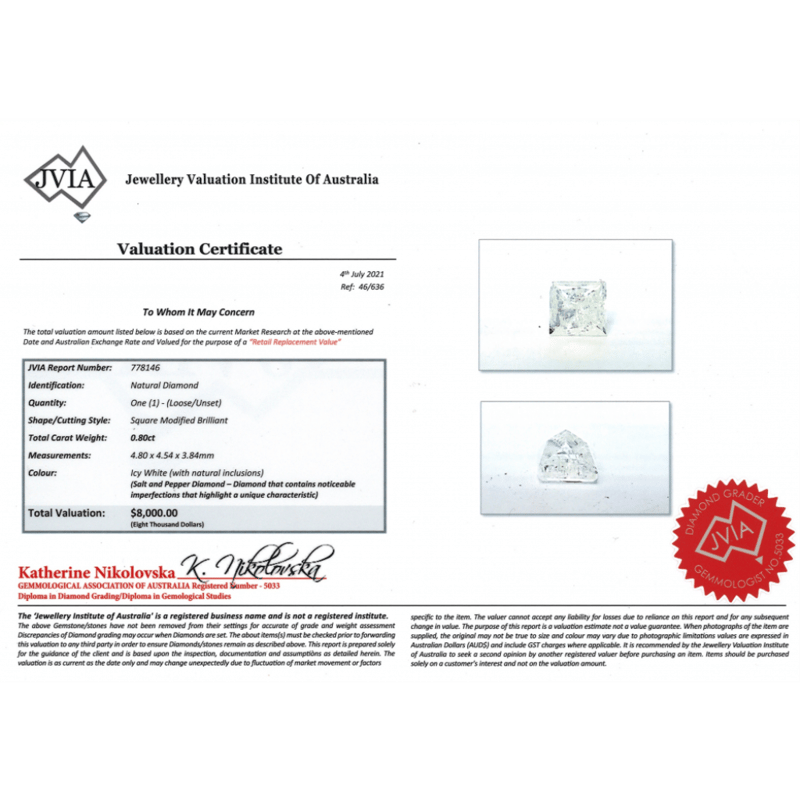 0.80CT NATURAL DIAMOND Square Modified Brilliant Cut, Icy White, Natural Inclusions, Loose, Unset. Valuations Provided by an Independent Third-Party Professional Not Directly Associated With Lloyds Auctions at AUD $$8,000.00This valuation has been conducted by an independent third-party professional. The valuation amount is an assessment by the issuing valuer and does not reflect the auction value of the item. Any inquiries regarding the valuation should be directed to the issuing valuer (refer to contact details on the certificate), as Lloyds Auctions has no affiliation or influence over the valuation, the valuer, or the stated amount. Condition: Good - Refer Images 0645966+2236