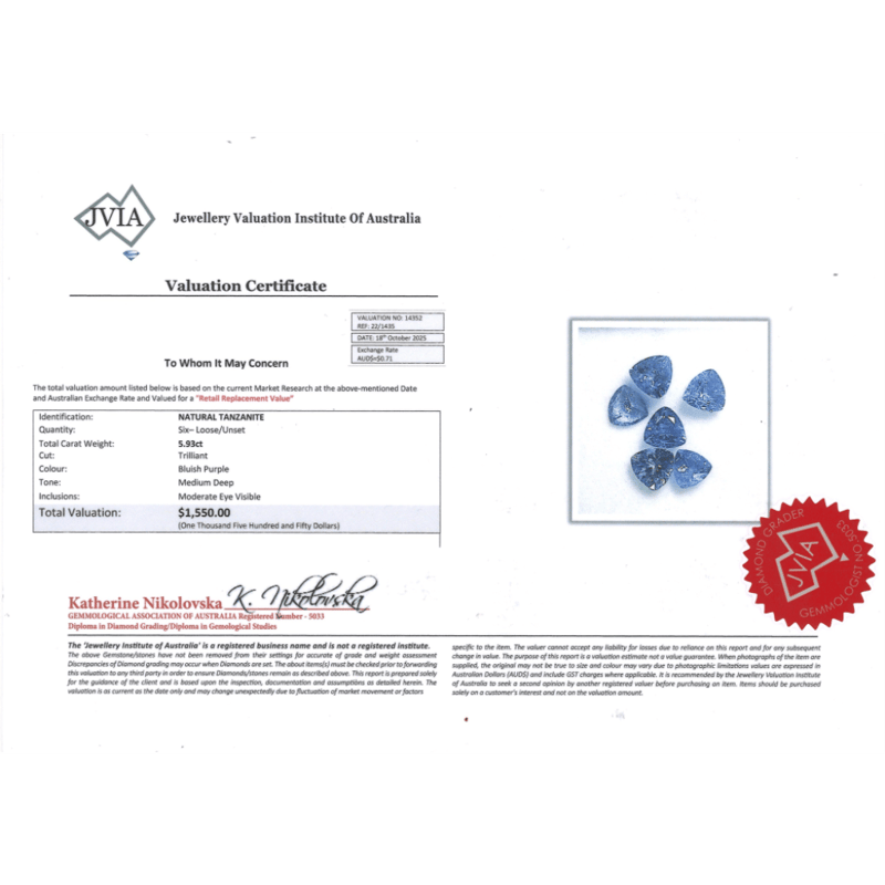 5.93CT TSW X 6, NATURAL TANZANITES Trilliant Faceted Cut, Medium Deep Bluish-Purple, Inclusions, Loose, Unset. Valuations Provided by an Independent Third-Party Professional Not Directly Associated With Lloyds Auctions at AUD $$1,550.00This valuation has been conducted by an independent third-party professional. The valuation amount is an assessment by the issuing valuer and does not reflect the auction value of the item. Any inquiries regarding the valuation should be directed to the issuing valuer (refer to contact details on the certificate), as Lloyds Auctions has no affiliation or influence over the valuation, the valuer, or the stated amount. Condition: Good - Refer Images 0645966+2240