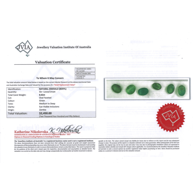 8.62CT TSW X 6, NATURAL BERYL ZAMBIAN EMERALDS Oval Faceted Cut, Medium-Deep Green, Eye Visible Inclusions, Zambian Origin, Loose, Unset. Valuations Provided by an Independent Third-Party Professional Not Directly Associated With Lloyds Auctions at AUD $$2,450.00This valuation has been conducted by an independent third-party professional. The valuation amount is an assessment by the issuing valuer and does not reflect the auction value of the item. Any inquiries regarding the valuation should be directed to the issuing valuer (refer to contact details on the certificate), as Lloyds Auctions has no affiliation or influence over the valuation, the valuer, or the stated amount. Condition: Good - Refer Images 0645966+2244