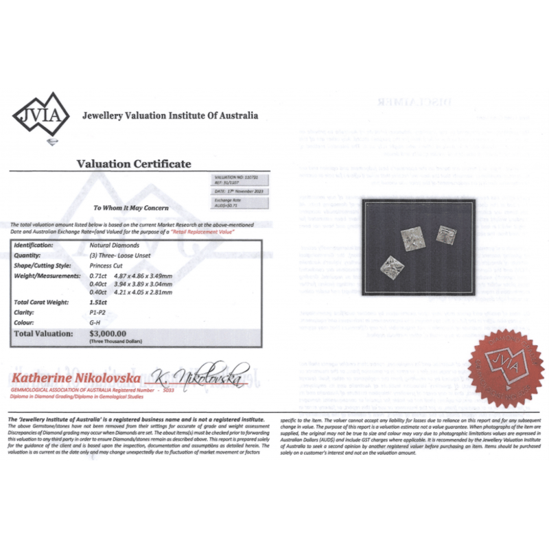 1.51CT TDW X 3, NATURAL DIAMONDS Princess Cut, G-H Colour, P1-P2 Clarity, Loose, Unset. Valuations Provided by an Independent Third-Party Professional Not Directly Associated With Lloyds Auctions at AUD $$3,000.00This valuation has been conducted by an independent third-party professional. The valuation amount is an assessment by the issuing valuer and does not reflect the auction value of the item. Any inquiries regarding the valuation should be directed to the issuing valuer (refer to contact details on the certificate), as Lloyds Auctions has no affiliation or influence over the valuation, the valuer, or the stated amount. Condition: Good - Refer Images 0645966+2247