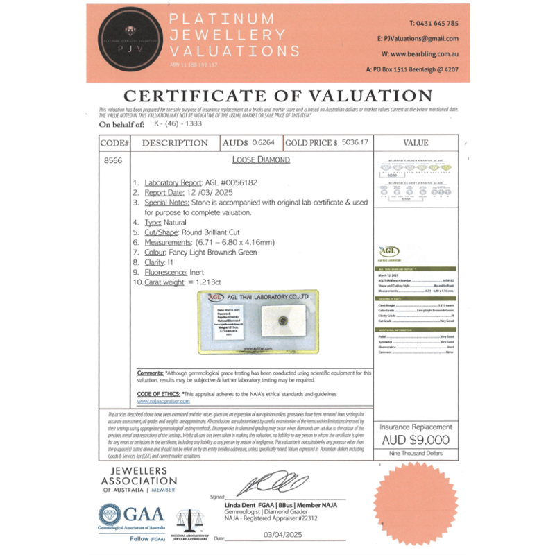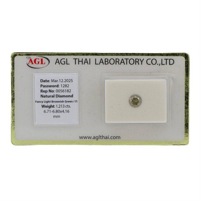 1.213CT CERTIFIED, NATURAL BROWN/GREEN DIAMOND Round Brilliant Cut, Fancy Light Brownish-Green Colour, I1 Clarity, Loose, Unset. Stone Comes Sealed With Agl Report: 0056182. Valuations Provided by an Independent Third-Party Professional Not Directly Associated With Lloyds Auctions at AUD $$9,000.00This valuation has been conducted by an independent third-party professional. The valuation amount is an assessment by the issuing valuer and does not reflect the auction value of the item. Any inquiries regarding the valuation should be directed to the issuing valuer (refer to contact details on the certificate), as Lloyds Auctions has no affiliation or influence over the valuation, the valuer, or the stated amount. Condition: Good - Refer Images 0645966+2252