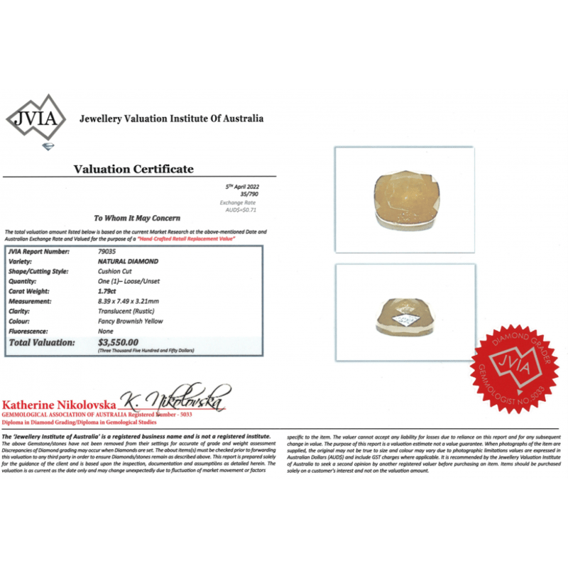 1.79CT NATURAL FANCY YELLOW DIAMOND Cushion Cut, Fancy Brownish Yellow, Translucent, Loose, Unset. Valuations Provided by an Independent Third-Party Professional Not Directly Associated With Lloyds Auctions at AUD $$3,550.00This valuation has been conducted by an independent third-party professional. The valuation amount is an assessment by the issuing valuer and does not reflect the auction value of the item. Any inquiries regarding the valuation should be directed to the issuing valuer (refer to contact details on the certificate), as Lloyds Auctions has no affiliation or influence over the valuation, the valuer, or the stated amount. Condition: Good - Refer Images 0645966+2259