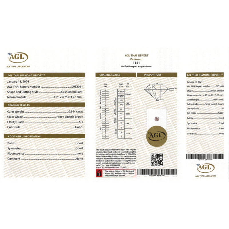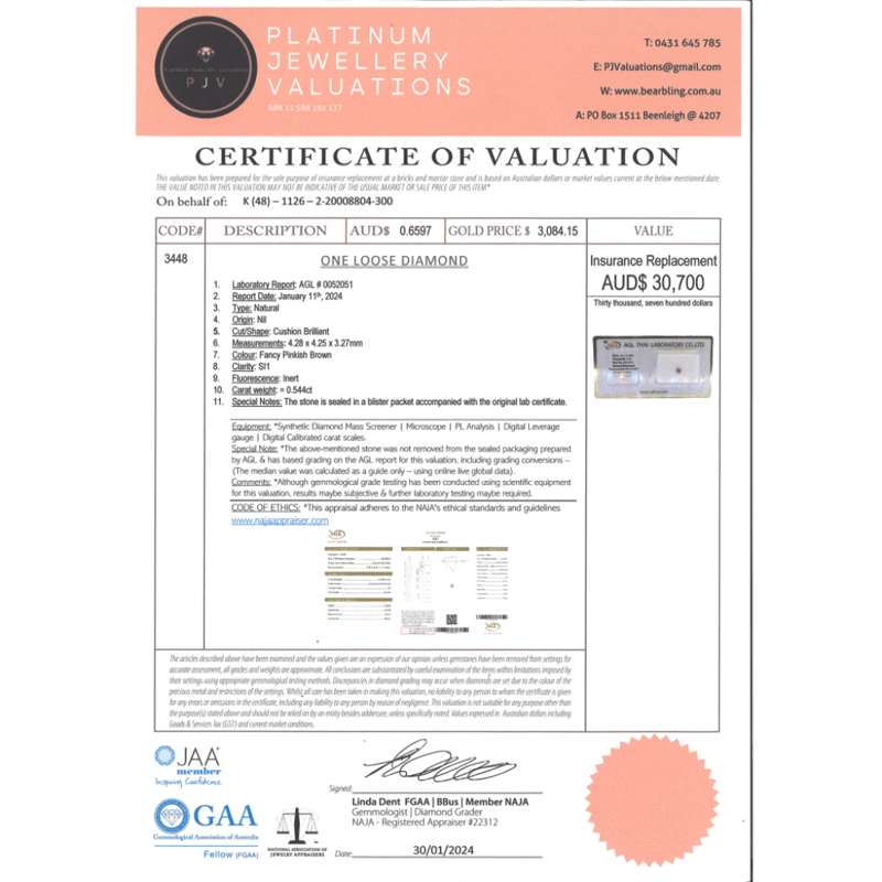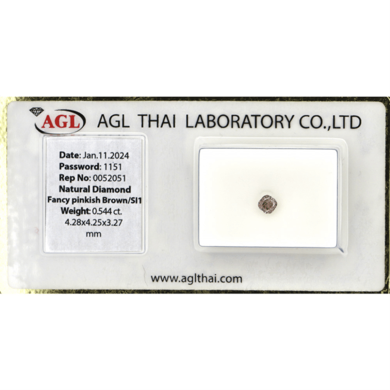0.544CT CERTIFIED, NATURAL FANCY PINK DIAMOND Cushion Brilliant Cut, Fancy Pinkish-Brown, Si1 Clarity, Loose, Unset. Stone Comes Sealed With Agl Report: 0052051. Valuations Provided by an Independent Third-Party Professional Not Directly Associated With Lloyds Auctions at AUD $$30,700.00This valuation has been conducted by an independent third-party professional. The valuation amount is an assessment by the issuing valuer and does not reflect the auction value of the item. Any inquiries regarding the valuation should be directed to the issuing valuer (refer to contact details on the certificate), as Lloyds Auctions has no affiliation or influence over the valuation, the valuer, or the stated amount. Condition: Good - Refer Images 0645966+2260