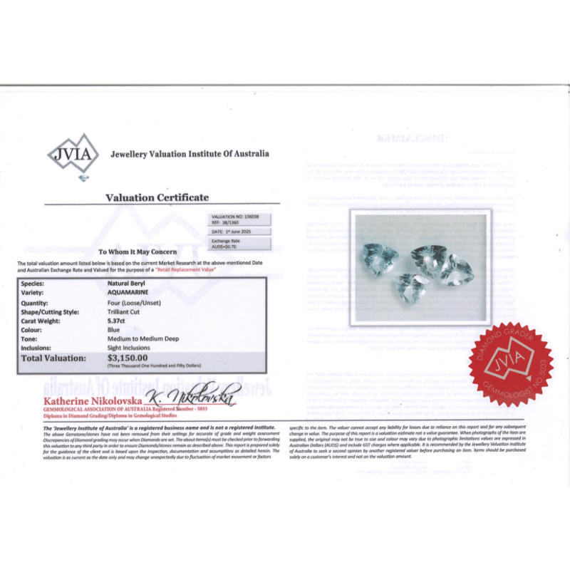 5.37CT TSW X 4, NATURAL BERYL AQUAMARINES Trillion Cut, Medium Blue, Slightly Included, Loose, Unset. Valuations Provided by an Independent Third-Party Professional Not Directly Associated With Lloyds Auctions at AUD $$3,150.00This valuation has been conducted by an independent third-party professional. The valuation amount is an assessment by the issuing valuer and does not reflect the auction value of the item. Any inquiries regarding the valuation should be directed to the issuing valuer (refer to contact details on the certificate), as Lloyds Auctions has no affiliation or influence over the valuation, the valuer, or the stated amount. Condition: Good - Refer Images 0645966+2262
