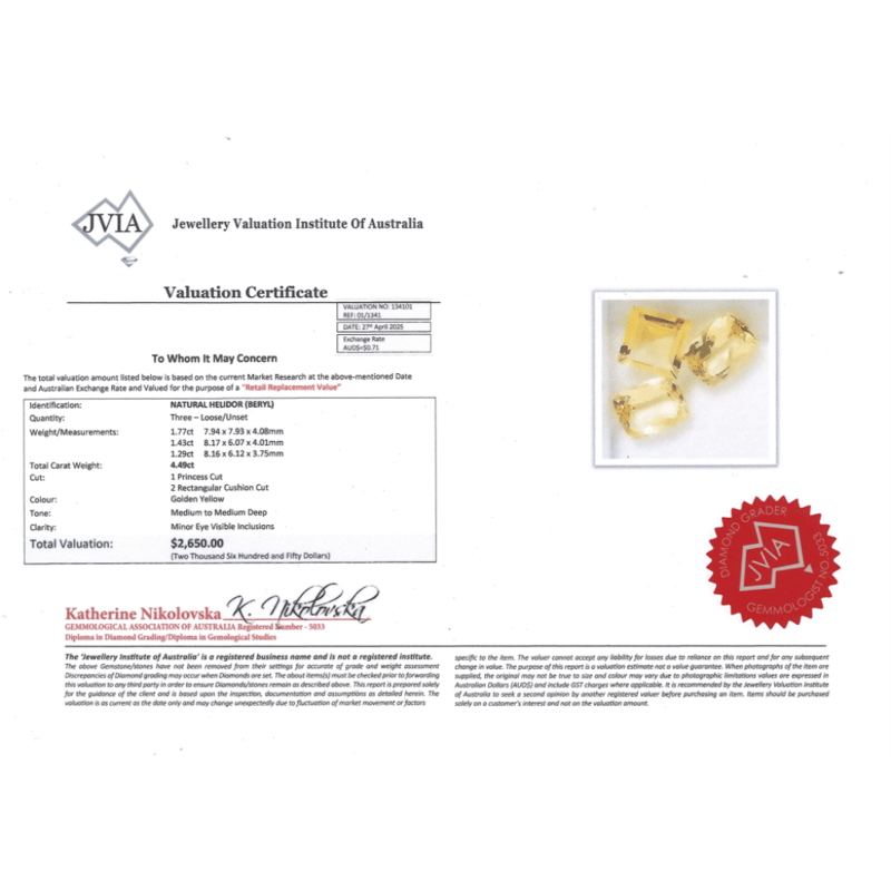 4.49CT TSW X 3, NATURAL BERYL HELIODOR Rectangular Cushion/Princess Cut, Golden Yellow, Minor Eye Visible Inclusions, Loose, Unset. Valuations Provided by an Independent Third-Party Professional Not Directly Associated With Lloyds Auctions at AUD $$2,650.00This valuation has been conducted by an independent third-party professional. The valuation amount is an assessment by the issuing valuer and does not reflect the auction value of the item. Any inquiries regarding the valuation should be directed to the issuing valuer (refer to contact details on the certificate), as Lloyds Auctions has no affiliation or influence over the valuation, the valuer, or the stated amount. Condition: Good - Refer Images 0645966+2271