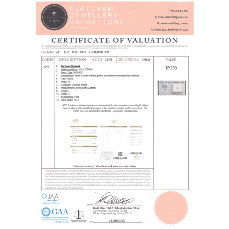 1.013CT CERTIFIED, NATURAL DIAMOND Marquise Brilliant Cut, J Colour, I1 Clarity, Loose, Unset. Stone Comes Sealed With Agl Report: 0050854. Valuations Provided by an Independent Third-Party Professional Not Directly Associated With Lloyds Auctions at AUD $$9,900.00This valuation has been conducted by an independent third-party professional. The valuation amount is an assessment by the issuing valuer and does not reflect the auction value of the item. Any inquiries regarding the valuation should be directed to the issuing valuer (refer to contact details on the certificate), as Lloyds Auctions has no affiliation or influence over the valuation, the valuer, or the stated amount. Condition: Good - Refer Images 0645970+2321