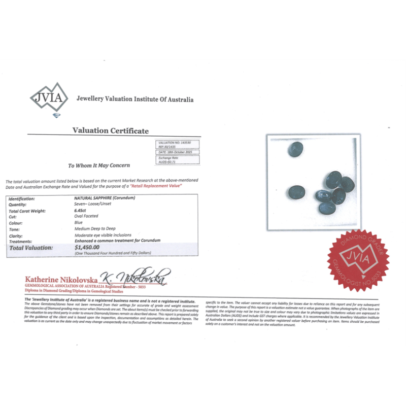 6.45CT TSW X 7, NATURAL CORUNDUM SAPPHIRES Oval Faceted Cut, Medium-Deep Blue, Moderate Eye Visible Inclusions, Loose, Unset. Valuations Provided by an Independent Third-Party Professional Not Directly Associated With Lloyds Auctions at AUD $$1,450.00This valuation has been conducted by an independent third-party professional. The valuation amount is an assessment by the issuing valuer and does not reflect the auction value of the item. Any inquiries regarding the valuation should be directed to the issuing valuer (refer to contact details on the certificate), as Lloyds Auctions has no affiliation or influence over the valuation, the valuer, or the stated amount. Condition: Good - Refer Images 0645970+2334