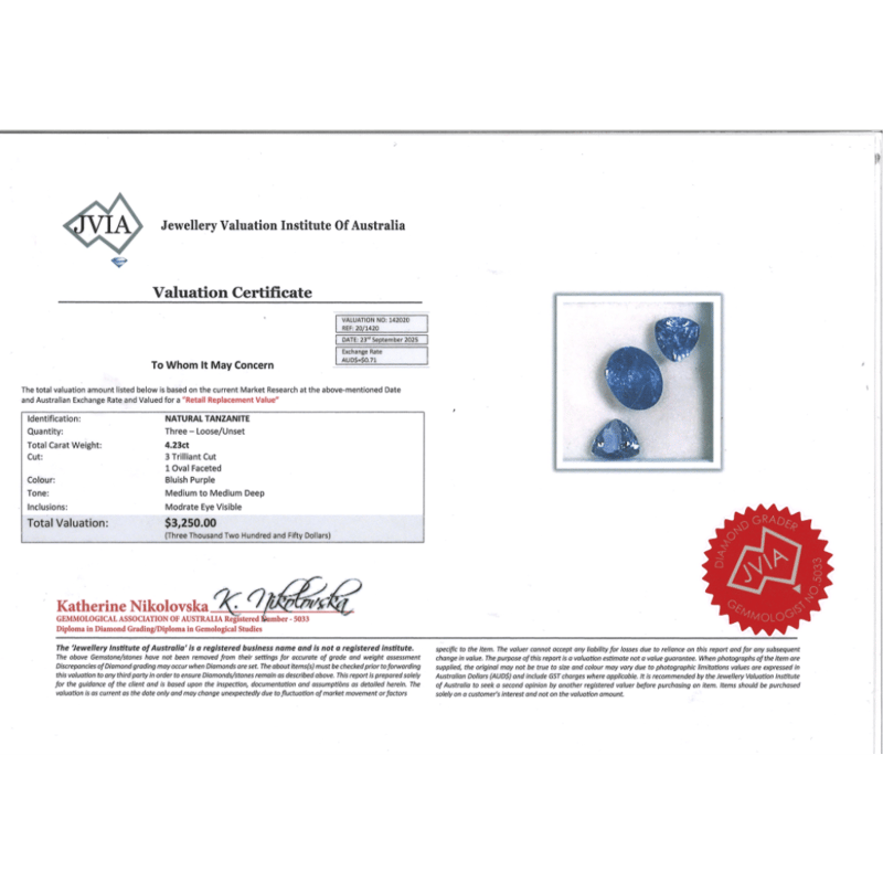 4.23CT TSW X 3, NATURAL TANZANITES Oval Faceted/Trillion Cut, Bluish-Purple, Moderate Eye Visible Inclusions, Loose, Unset. Valuations Provided by an Independent Third-Party Professional Not Directly Associated With Lloyds Auctions at AUD $$3,250.00This valuation has been conducted by an independent third-party professional. The valuation amount is an assessment by the issuing valuer and does not reflect the auction value of the item. Any inquiries regarding the valuation should be directed to the issuing valuer (refer to contact details on the certificate), as Lloyds Auctions has no affiliation or influence over the valuation, the valuer, or the stated amount. Condition: Good - Refer Images 0645970+2335