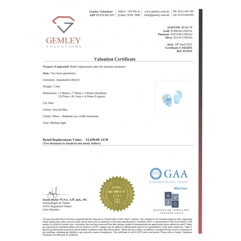 Pear Cut, Medium Light Greyish-Blue, Minor-Moderate Eye Visible Inclusions, Loose, Unset.