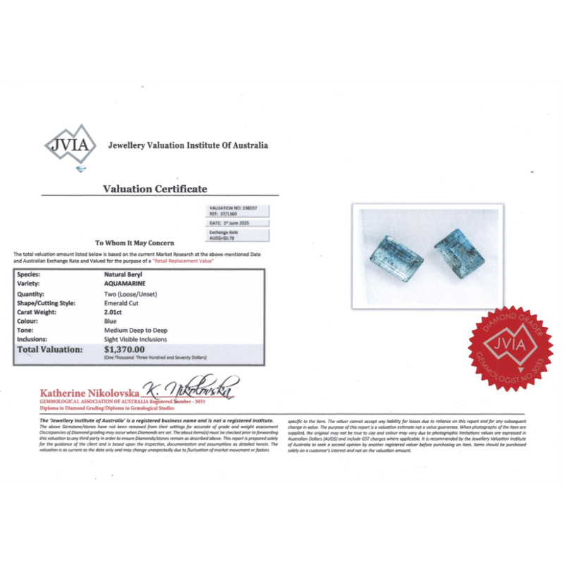 2.01CT TSW X 2, NATURAL BERYL AQUAMARINES Emerald Cut, Medium Deep Blue, Slight Visible Inclusions, Loose, Unset. Valuations Provided by an Independent Third-Party Professional Not Directly Associated With Lloyds Auctions at AUD $$1,370.00This valuation has been conducted by an independent third-party professional. The valuation amount is an assessment by the issuing valuer and does not reflect the auction value of the item. Any inquiries regarding the valuation should be directed to the issuing valuer (refer to contact details on the certificate), as Lloyds Auctions has no affiliation or influence over the valuation, the valuer, or the stated amount. Condition: Good - Refer Images 0645970+2367
