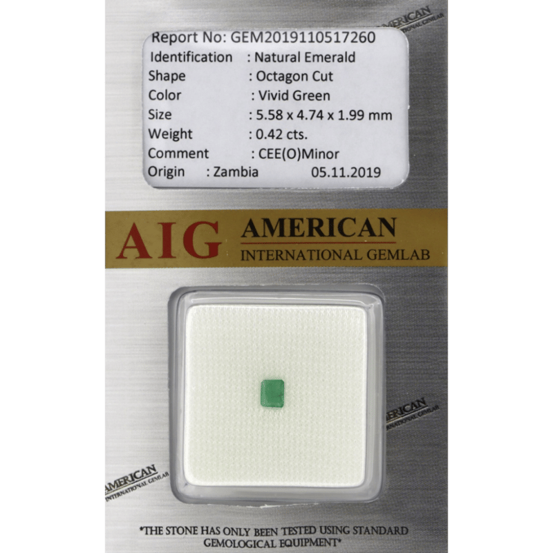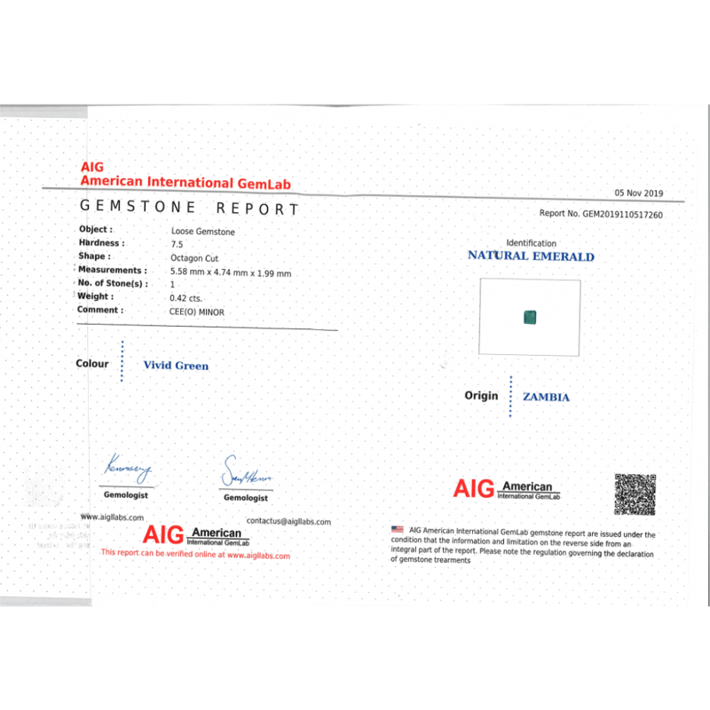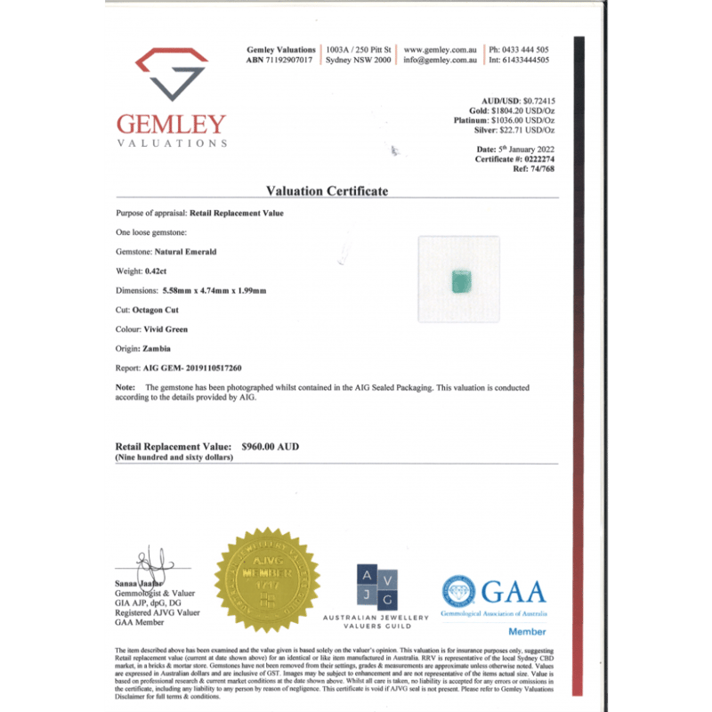 0.42CT CERTIFIED, NATURAL ZAMBIAN EMERALD Octagon Cut, Vivid Green, Zambian Origin, Loose, Unset. Stone Comes Sealed With Aig Report: Gem2019110517260. Valuations Provided by an Independent Third-Party Professional Not Directly Associated With Lloyds Auctions at AUD $$960.00This valuation has been conducted by an independent third-party professional. The valuation amount is an assessment by the issuing valuer and does not reflect the auction value of the item. Any inquiries regarding the valuation should be directed to the issuing valuer (refer to contact details on the certificate), as Lloyds Auctions has no affiliation or influence over the valuation, the valuer, or the stated amount. Condition: Good - Refer Images 0645970+2372