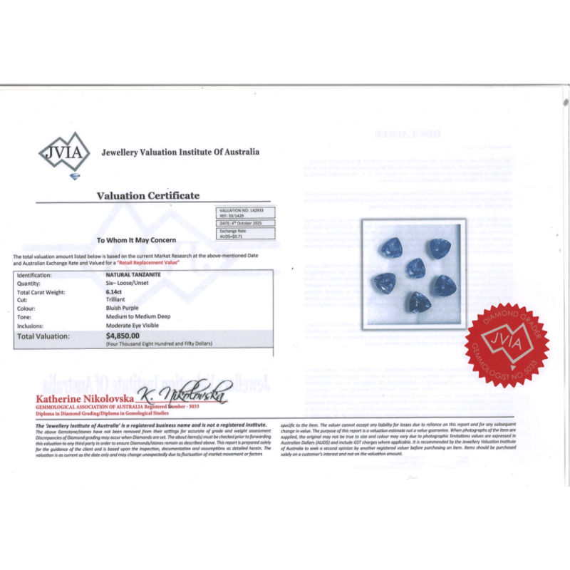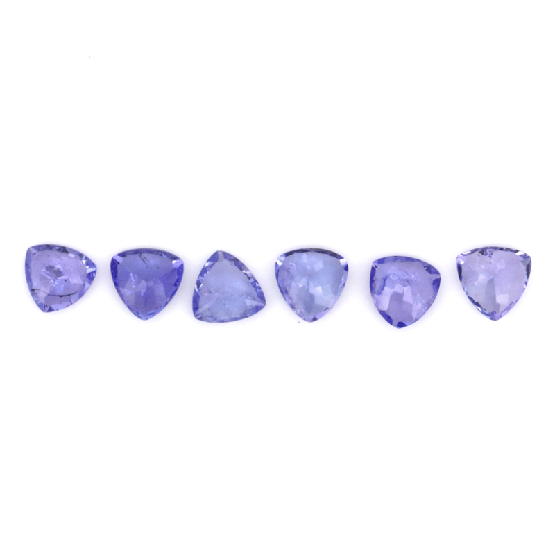 6.14CT TSW X 6, NATURAL TANZANITE'S Trilliant Cut, Bluish Purple, Moderate Eye Visible Inclusions, Loose, Unset. Valuations Provided by an Independent Third-Party Professional Not Directly Associated With Lloyds Auctions at AUD $$4,850.00This valuation has been conducted by an independent third-party professional. The valuation amount is an assessment by the issuing valuer and does not reflect the auction value of the item. Any inquiries regarding the valuation should be directed to the issuing valuer (refer to contact details on the certificate), as Lloyds Auctions has no affiliation or influence over the valuation, the valuer, or the stated amount. Condition: Good - Refer Images 0645970+2373