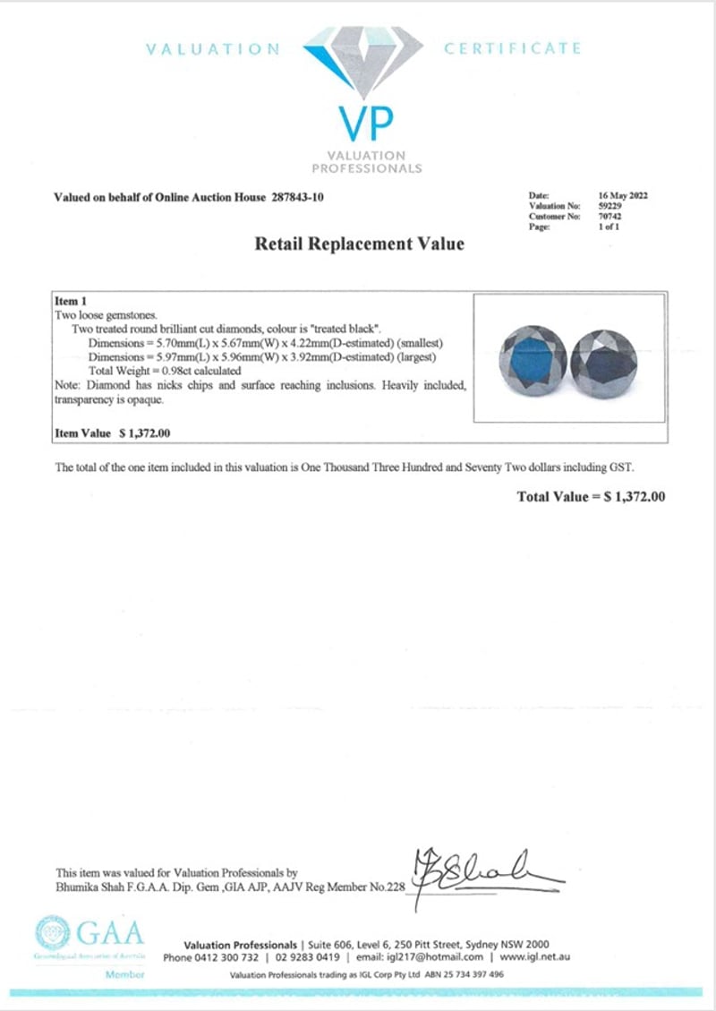 0.98CT TDW TREATED BRILLIANT DIAMONDS X2 Cut: Round Brilliant, Colour: Treated Black. Dimensions: 5.70Mm(L) X 5.67Mm(W) X 4.22(D-Estimated) (Smallest)Dimensions: 5.97Mm(L) X 5.96Mm(W) X 3.92Mm (D-Estimated) (LargestNote: Diamonds Has Nicks Chips And Surface Reaching Inclusions, Heavily Included, Transparency Is Opaque Condition: Good - Refer To Images This valuation has been conducted by an independent third-party professional. The valuation amount is an assessment by the issuing valuer and does not reflect the auction value of the item. Any inquiries regarding the valuation should be directed to the issuing valuer (refer to contact details on the certificate), as Lloyds Auctions has no affiliation or influence over the valuation, the valuer, or the stated amount. Insurance Replacement Valuation Amount: $1,372.00 SR 233619+2