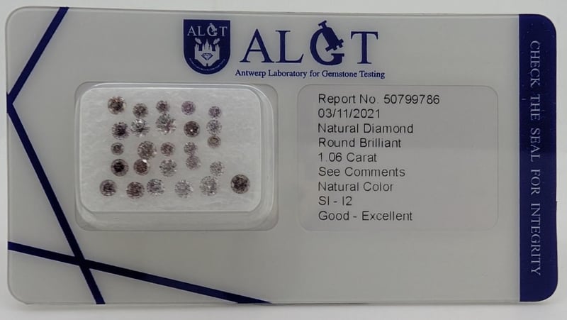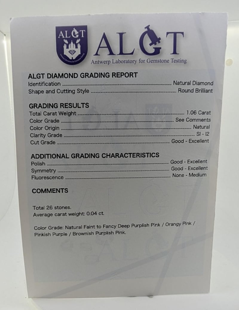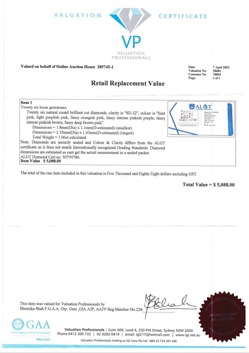 1.06CT TDW NATURAL DIAMONDS 26 X Natural Round Brilliant Cut Diamonds Cut: Round Brilliant, Clarity: Si1-I2, Colour: Faint Pink, Light Purplish Pink, Fancy Orangish Pink, Fancy Intense Pinkish Purple, Fancy Intense Pinkish Brown, Fancy Deep Brown Pink Aglt Diamond Certificate # 50799786Dimensions: 1.8Mm(Dia) X 1.1Mm(D-Estimated) (Smallest) Dimensions: 2.35Mm(Dia) X 1.43(D-Estimated) (Largest) Condition: Good - Refer To Images This valuation has been conducted by an independent third-party professional. The valuation amount is an assessment by the issuing valuer and does not reflect the auction value of the item. Any inquiries regarding the valuation should be directed to the issuing valuer (refer to contact details on the certificate), as Lloyds Auctions has no affiliation or influence over the valuation, the valuer, or the stated amount. Insurance Replacement Valuation Amount: $5,088.00 SR 233619+5