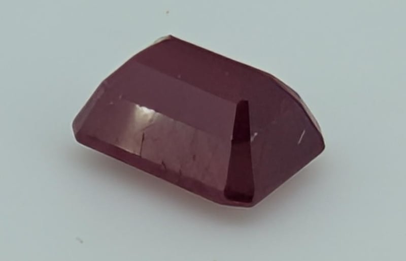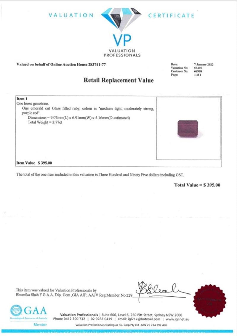 3.77CT EMERALD CUT GLASS FILLED RUBY Cut: Emerald, Colour: Medium Light, Moderately Strong Purple Red Dimensions: 9.07Mm(L) X 6.91Mm(W) X 5.16Mm(D-Estimated) Condition: Good - Refer To Images This valuation has been conducted by an independent third-party professional. The valuation amount is an assessment by the issuing valuer and does not reflect the auction value of the item. Any inquiries regarding the valuation should be directed to the issuing valuer (refer to contact details on the certificate), as Lloyds Auctions has no affiliation or influence over the valuation, the valuer, or the stated amount. Insurance Replacement Valuation Amount: $395.00 SR 233619+7