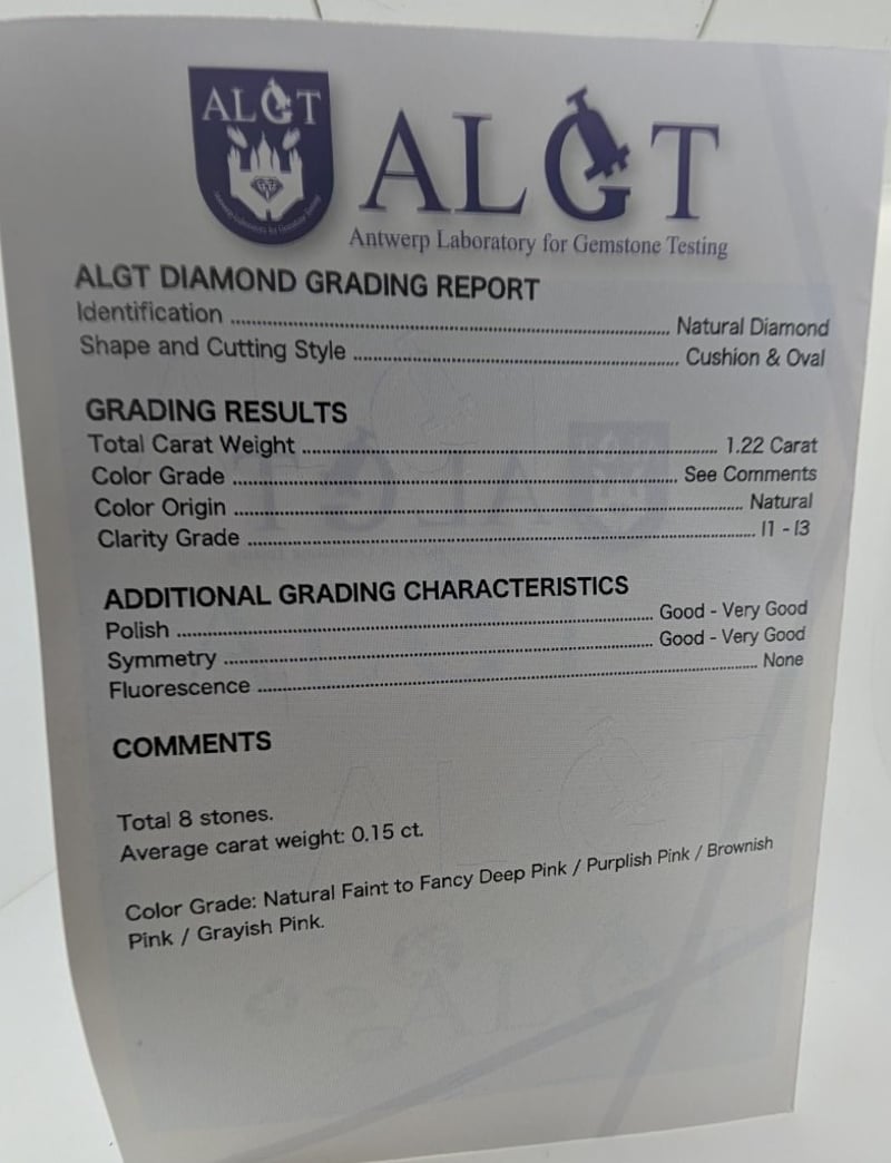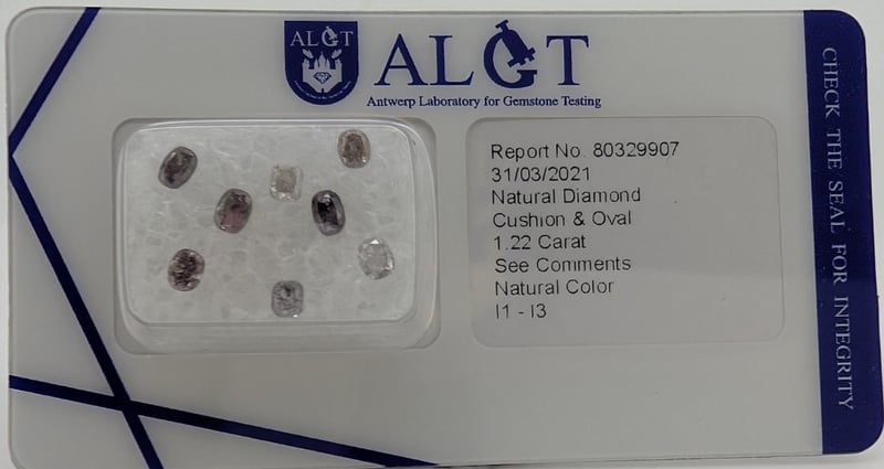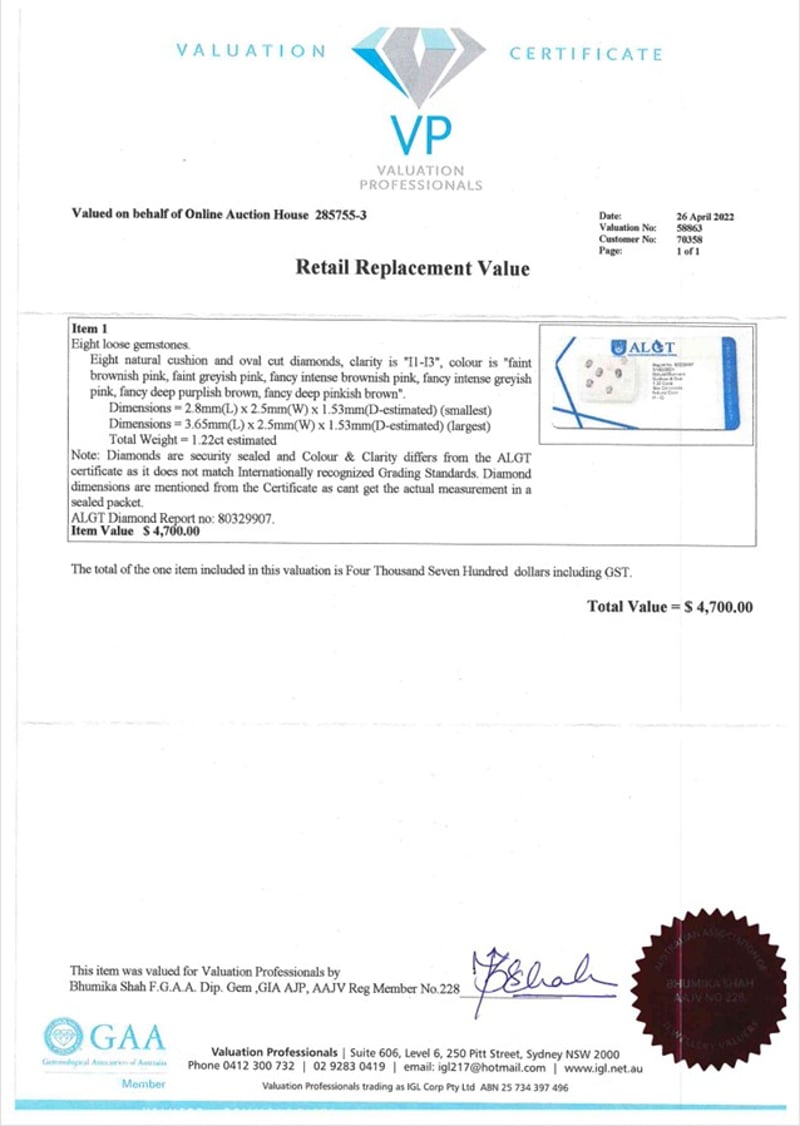 1.22CT TDW NATURAL DIAMONDS 8 X Loose Diamonds Cut: Cushion And Oval, Clarity: I1-I3, Colour: Faint Brownish Pink, Faint Greyish Pink, Fancy Intense Greyish Pink, Fancy Deep Purplish Brown, Fancy Deep Pinkish Brown Algt Diamond Report No: 80329907Dimensions: 2.8Mm(L) X 2.5Mm(W) X 1.53Mm(D-Estimated) (Smallest)Dimensions: 3.6Mm(L) X 2.5Mm(W) X 1.53Mm(D-Estimated) (Largest) Condition: Good - Refer To Images This valuation has been conducted by an independent third-party professional. The valuation amount is an assessment by the issuing valuer and does not reflect the auction value of the item. Any inquiries regarding the valuation should be directed to the issuing valuer (refer to contact details on the certificate), as Lloyds Auctions has no affiliation or influence over the valuation, the valuer, or the stated amount. Insurance Replacement Valuation Amount: $4,700.00 SR 233619+10