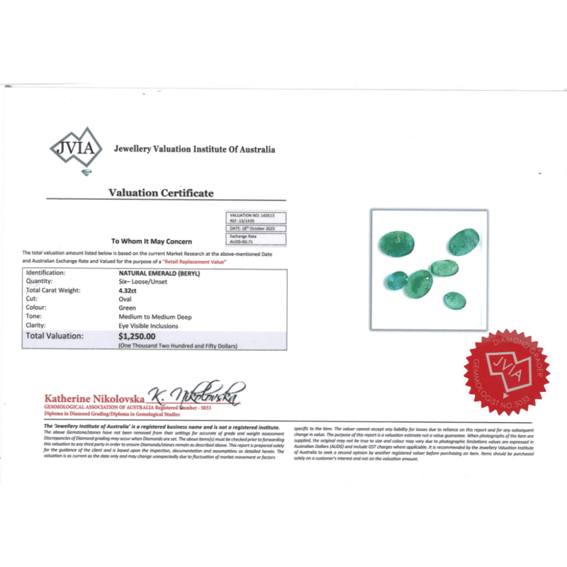 4.32CT TSW X 6, NATURAL EMERALDS Oval Cut, Medium-Deep Green, Eye Visible Inclusions, Loose, Unset. Valuations Provided by an Independent Third-Party Professional Not Directly Associated With Lloyds Auctions at AUD $$12,500.00This valuation has been conducted by an independent third-party professional. The valuation amount is an assessment by the issuing valuer and does not reflect the auction value of the item. Any inquiries regarding the valuation should be directed to the issuing valuer (refer to contact details on the certificate), as Lloyds Auctions has no affiliation or influence over the valuation, the valuer, or the stated amount. Condition: Good - Refer Images 0645974+2208