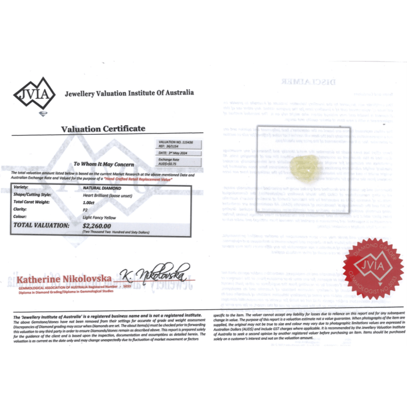 1.00CT NATURAL FANCY YELLOW DIAMOND Heart Trilliant Cut, Light Fancy Yellow, P2, Loose, Unset. Valuations Provided by an Independent Third-Party Professional Not Directly Associated With Lloyds Auctions at AUD $$2,260.00This valuation has been conducted by an independent third-party professional. The valuation amount is an assessment by the issuing valuer and does not reflect the auction value of the item. Any inquiries regarding the valuation should be directed to the issuing valuer (refer to contact details on the certificate), as Lloyds Auctions has no affiliation or influence over the valuation, the valuer, or the stated amount. Condition: Good - Refer Images 0645974+2216
