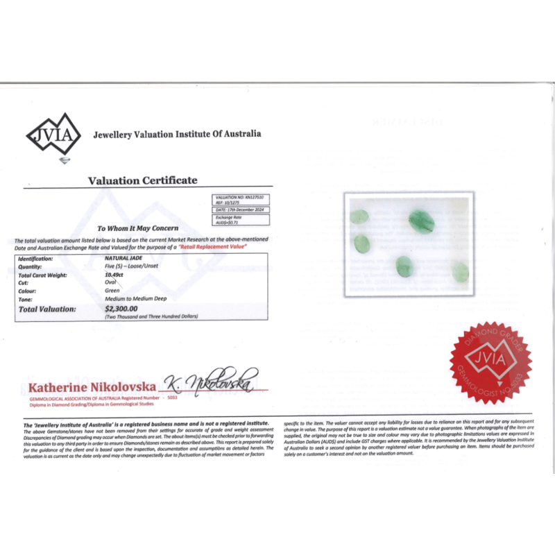 10.49CT TSW X 5, NATURAL JADE Medium-Medium Deep Green, Loose, Unset. Valuations Provided by an Independent Third-Party Professional Not Directly Associated With Lloyds Auctions at AUD $$2,300.00This valuation has been conducted by an independent third-party professional. The valuation amount is an assessment by the issuing valuer and does not reflect the auction value of the item. Any inquiries regarding the valuation should be directed to the issuing valuer (refer to contact details on the certificate), as Lloyds Auctions has no affiliation or influence over the valuation, the valuer, or the stated amount. Condition: Good - Refer Images 0645974+2224