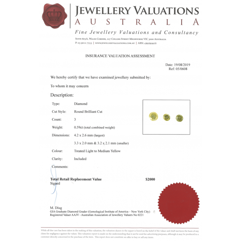 0.59CT TDW X 3, NATURAL YELLOW DIAMONDS Round Brilliant Cut, Treated Light-Medium Yellow, Included, Enhanced, Loose, Unset. Valuations Provided by an Independent Third-Party Professional Not Directly Associated With Lloyds Auctions at AUD $$2,000.00This valuation has been conducted by an independent third-party professional. The valuation amount is an assessment by the issuing valuer and does not reflect the auction value of the item. Any inquiries regarding the valuation should be directed to the issuing valuer (refer to contact details on the certificate), as Lloyds Auctions has no affiliation or influence over the valuation, the valuer, or the stated amount. Condition: Good - Refer Images 0645974+2231