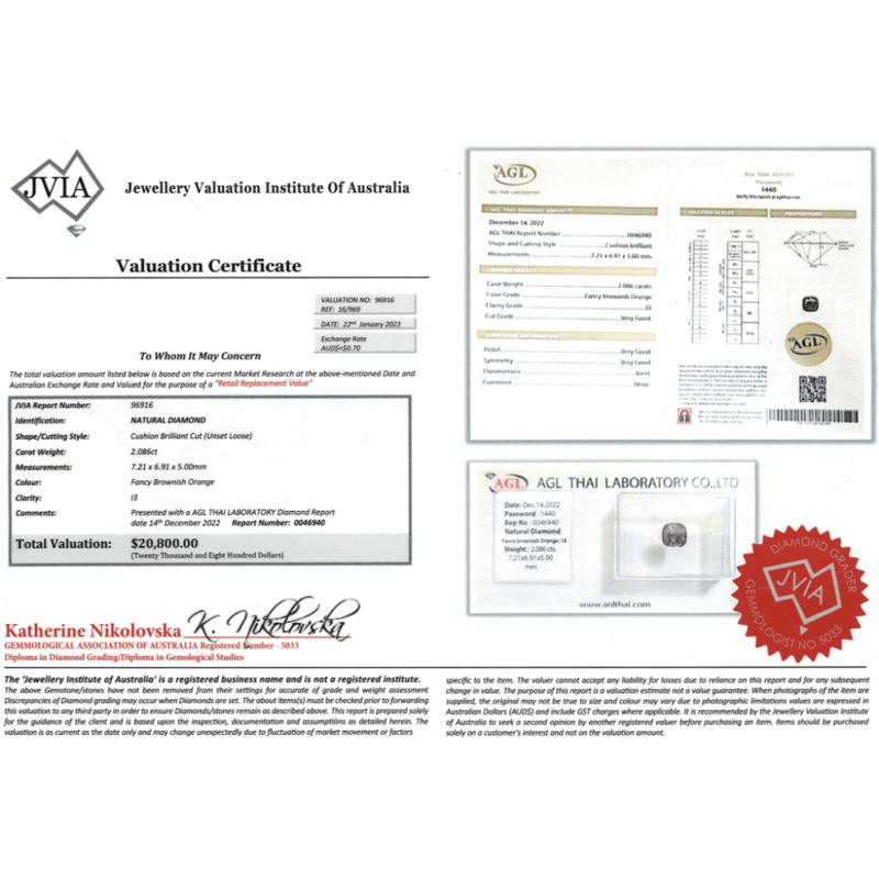 2.086CT CERTIFIED, NATURAL FANCY ORANGE DIAMOND Cushion Brilliant Cut, Fancy Brownish-Orange, I3 Clarity, Loose, Unset. Stone Comes Sealed With Agl Report: 0046940. Valuations Provided by an Independent Third-Party Professional Not Directly Associated With Lloyds Auctions at AUD $$20,800.00This valuation has been conducted by an independent third-party professional. The valuation amount is an assessment by the issuing valuer and does not reflect the auction value of the item. Any inquiries regarding the valuation should be directed to the issuing valuer (refer to contact details on the certificate), as Lloyds Auctions has no affiliation or influence over the valuation, the valuer, or the stated amount. Condition: Good - Refer Images 0645974+2242