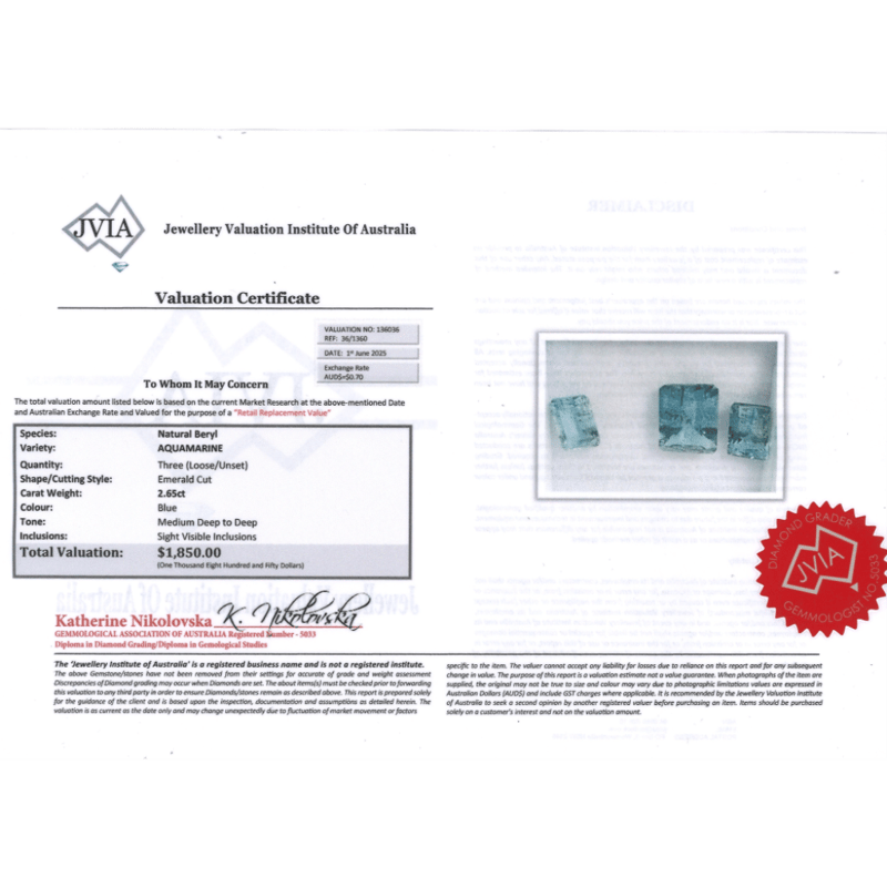 2.65CT TSW X 3, NATURAL BERYL AQUAMARINES Emerald Cut, Medium-Deep Blue, Slight Visible Inclusions, Loose, Unset. Valuations Provided by an Independent Third-Party Professional Not Directly Associated With Lloyds Auctions at AUD $$1,850.00This valuation has been conducted by an independent third-party professional. The valuation amount is an assessment by the issuing valuer and does not reflect the auction value of the item. Any inquiries regarding the valuation should be directed to the issuing valuer (refer to contact details on the certificate), as Lloyds Auctions has no affiliation or influence over the valuation, the valuer, or the stated amount. Condition: Good - Refer Images 0645974+2243