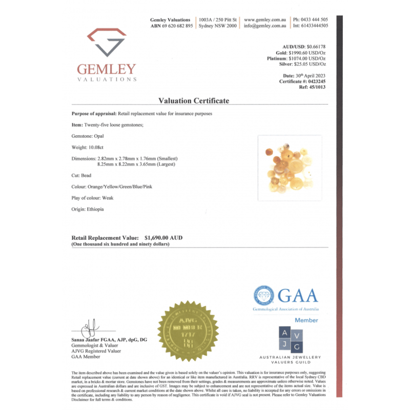 10.08CT TSW X 25, ETHIOPIAN OPAL BEADS Round With Pre-Drilled Holes, Weak Colour Play Of Orange/Yellow/Green/Blue/Pink, Ethiopian Origin, Loose, Unset. Valuations Provided by an Independent Third-Party Professional Not Directly Associated With Lloyds Auctions at AUD $$1,690.00This valuation has been conducted by an independent third-party professional. The valuation amount is an assessment by the issuing valuer and does not reflect the auction value of the item. Any inquiries regarding the valuation should be directed to the issuing valuer (refer to contact details on the certificate), as Lloyds Auctions has no affiliation or influence over the valuation, the valuer, or the stated amount. Condition: Good - Refer Images 0645974+2247