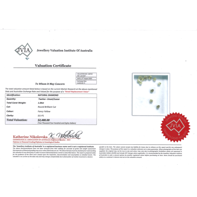 1.04CT TDW X 12, NATURAL FANCY YELLOW DIAMONDS Round Brilliant Cut, Fancy Yellow Colour, Si1-P1 Clarity, Loose, Unset. Valuations Provided by an Independent Third-Party Professional Not Directly Associated With Lloyds Auctions at AUD $$2,480.00This valuation has been conducted by an independent third-party professional. The valuation amount is an assessment by the issuing valuer and does not reflect the auction value of the item. Any inquiries regarding the valuation should be directed to the issuing valuer (refer to contact details on the certificate), as Lloyds Auctions has no affiliation or influence over the valuation, the valuer, or the stated amount. Condition: Good - Refer Images 0645974+2248