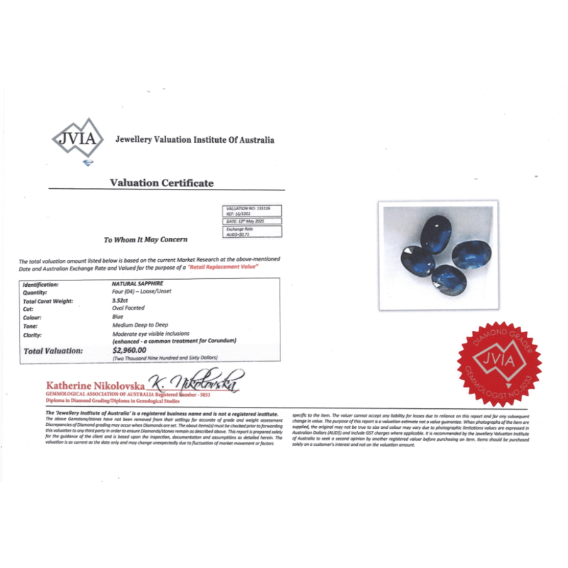 3.52CT TSW X 4, NATURAL BLUE CORUNDUM SAPPHIRES Oval Faceted Cut, Medium-Deep Blue, Moderate Eye Visible Inclusions, Loose, Unset. Valuations Provided by an Independent Third-Party Professional Not Directly Associated With Lloyds Auctions at AUD $$2,960.00This valuation has been conducted by an independent third-party professional. The valuation amount is an assessment by the issuing valuer and does not reflect the auction value of the item. Any inquiries regarding the valuation should be directed to the issuing valuer (refer to contact details on the certificate), as Lloyds Auctions has no affiliation or influence over the valuation, the valuer, or the stated amount. Condition: Good - Refer Images 0645974+2249