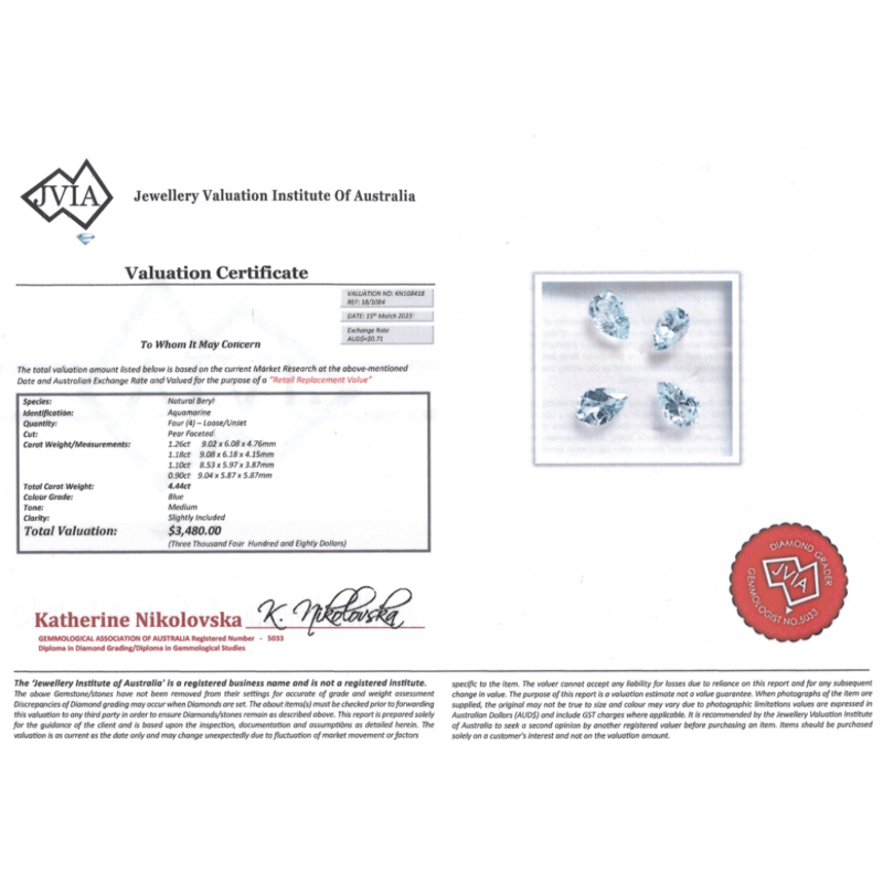 4.44CT TSW X 4, NATURAL BERYL AQUAMARINES Pear Faceted Cut, Medium Blue, Slightly Included, Loose, Unset. Valuations Provided by an Independent Third-Party Professional Not Directly Associated With Lloyds Auctions at AUD $$3,480.00This valuation has been conducted by an independent third-party professional. The valuation amount is an assessment by the issuing valuer and does not reflect the auction value of the item. Any inquiries regarding the valuation should be directed to the issuing valuer (refer to contact details on the certificate), as Lloyds Auctions has no affiliation or influence over the valuation, the valuer, or the stated amount. Condition: Good - Refer Images 0645974+2250