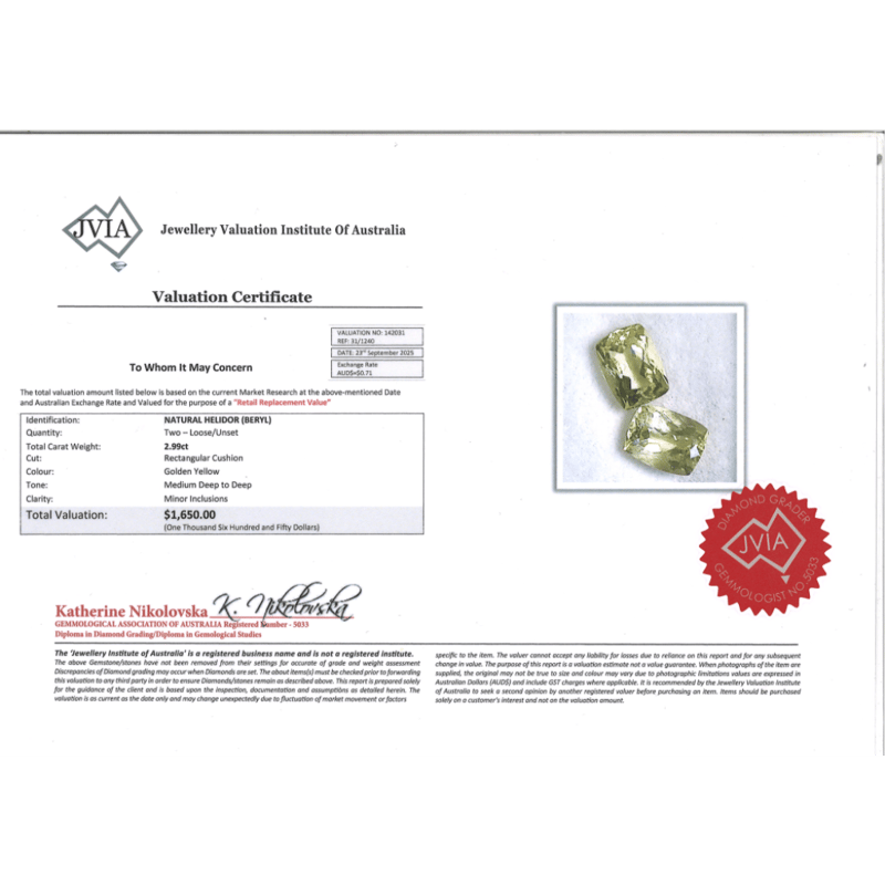 2.99CT TSW X 2, NATURAL BERYL HELIODOR Rectangular Cushion Cut, Golden Yellow, Minor Inclusions, Loose, Unset Valuations Provided by an Independent Third-Party Professional Not Directly Associated With Lloyds Auctions at AUD $$1,650.00This valuation has been conducted by an independent third-party professional. The valuation amount is an assessment by the issuing valuer and does not reflect the auction value of the item. Any inquiries regarding the valuation should be directed to the issuing valuer (refer to contact details on the certificate), as Lloyds Auctions has no affiliation or influence over the valuation, the valuer, or the stated amount. Condition: Good - Refer Images 0645974+2252