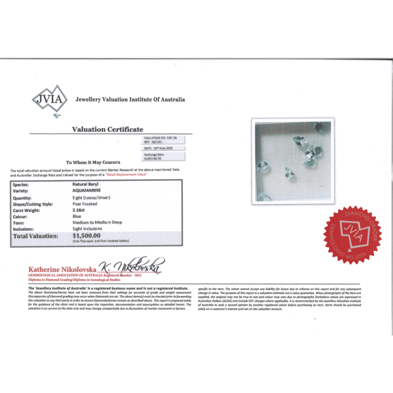 2.16CT TSW X 8, NATURAL BERYL AQUAMARINES Pear Faceted Cut, Medium Blue, Slightly Included, Loose, Unset. Valuations Provided by an Independent Third-Party Professional Not Directly Associated With Lloyds Auctions at AUD $$1,500.00This valuation has been conducted by an independent third-party professional. The valuation amount is an assessment by the issuing valuer and does not reflect the auction value of the item. Any inquiries regarding the valuation should be directed to the issuing valuer (refer to contact details on the certificate), as Lloyds Auctions has no affiliation or influence over the valuation, the valuer, or the stated amount. Condition: Good - Refer Images 0645974+2275