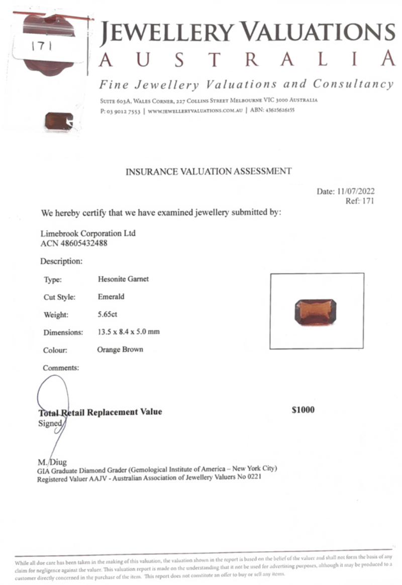 5.56CT HESONITE GARNET. ADDITIONAL $100 GIFT CARD, OURGIFT2U. Accompanied By Insurance Valuation Assessment And $100 Gift Card, Ourgift2U. Cut Style: Emerald. Colour: Orange Brown. Dimensions: Height: 13.50mm, Width: 8.40mm, Depth: 5.00mm Condition: Good - Refer To Images This valuation has been conducted by an independent third-party professional. The valuation amount is an assessment by the issuing valuer and does not reflect the auction value of the item. Any inquiries regarding the valuation should be directed to the issuing valuer (refer to contact details on the certificate), as Lloyds Auctions has no affiliation or influence over the valuation, the valuer, or the stated amount. Insurance Replacement Valuation Amount: $1,000.00 FC 162991+50