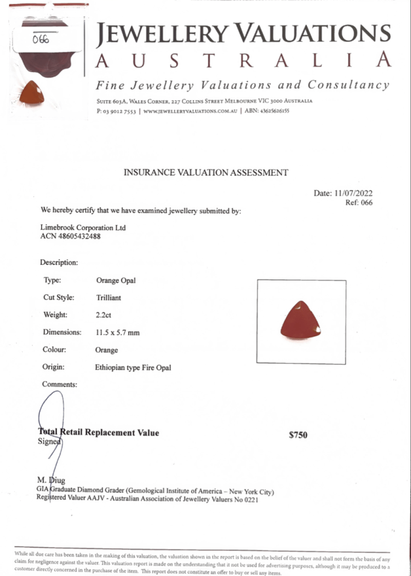 2.2CT TRILLIANT ORANGE OPAL. ADDITIONAL GIFT CARD $100, OURGIFT2U. Accompanied By Insurance Valuation Assessment And Additional Gift Card $100, Ourgift2U. Dimensions: 11.5 X 5.7Mm. Colour: Orange. Origin: Ethiopian Type Fire Opal. Condition: Good - Refer To Images This valuation has been conducted by an independent third-party professional. The valuation amount is an assessment by the issuing valuer and does not reflect the auction value of the item. Any inquiries regarding the valuation should be directed to the issuing valuer (refer to contact details on the certificate), as Lloyds Auctions has no affiliation or influence over the valuation, the valuer, or the stated amount. Insurance Replacement Valuation Amount: $750.00 FC 162991+29
