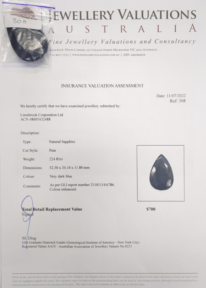 224.85CT NATURAL SAPPHIRE. ADDITIONAL GIFT CARD $100, OURGIFT2U. Accompanied By Insurance Valuation Assessment And $100 Gift Card, Ourgift2U. Cut Style: Pear. Colour: Very Dark Blue. As Per Gli Report #21101114A786 Colour Enhanced. Dimensions: Height: 52.50mm, Width: 34.10mm, Depth: 11.80mm Condition: Good - Refer To Images This valuation has been conducted by an independent third-party professional. The valuation amount is an assessment by the issuing valuer and does not reflect the auction value of the item. Any inquiries regarding the valuation should be directed to the issuing valuer (refer to contact details on the certificate), as Lloyds Auctions has no affiliation or influence over the valuation, the valuer, or the stated amount. Insurance Replacement Valuation Amount: $700.00 FC 162991+25