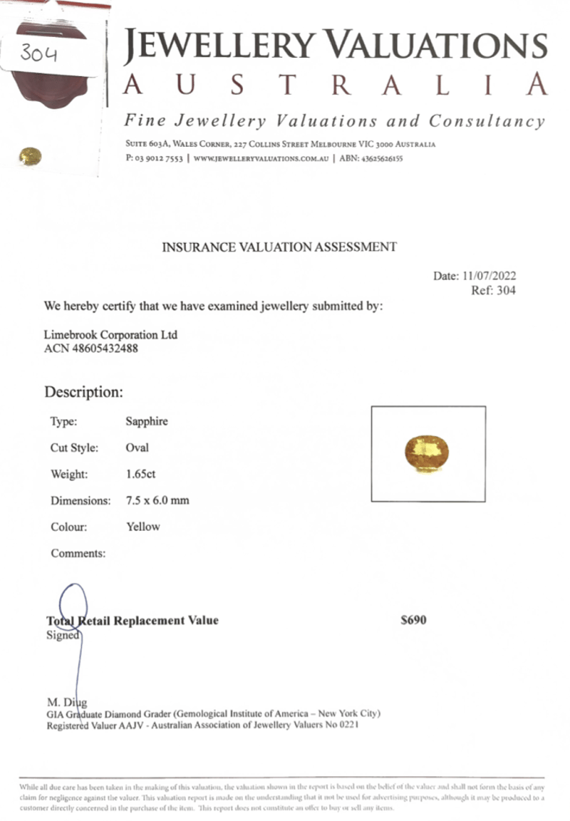 1.65CT OVAL SAPPHIRE. ADDITIONAL GIFT CARD $100, OURGIFT2U. Accompanied By Insurance Valuation Assessment And Gift Card $100, Ourgift2U. Colour: Yellow. Dimensions: 7.5 X 6Mm. Condition: Good - Refer To Images This valuation has been conducted by an independent third-party professional. The valuation amount is an assessment by the issuing valuer and does not reflect the auction value of the item. Any inquiries regarding the valuation should be directed to the issuing valuer (refer to contact details on the certificate), as Lloyds Auctions has no affiliation or influence over the valuation, the valuer, or the stated amount. Insurance Replacement Valuation Amount: $690.00 FC 162991+27