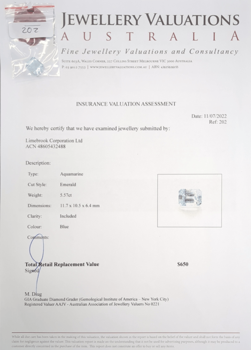 5.57CT EMERALD AQUAMARINE. ADDITIONAL GIFT CARD $50, OURGIFT2U. Accompanied By Insurance Valuation Assessment And $50 Ourgift2U Gift Card. Clarity: Included. Colour: Blue Dimensions: Height: 11.70mm, Width: 10.50mm, Depth: 6.40mm Condition: Good - Refer To Images This valuation has been conducted by an independent third-party professional. The valuation amount is an assessment by the issuing valuer and does not reflect the auction value of the item. Any inquiries regarding the valuation should be directed to the issuing valuer (refer to contact details on the certificate), as Lloyds Auctions has no affiliation or influence over the valuation, the valuer, or the stated amount. Insurance Replacement Valuation Amount: $650.00 FC 162991+18