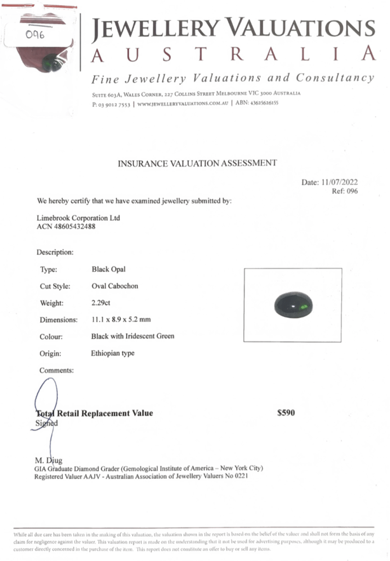 2.29CT BLACK OPAL. ADDITIONAL $50 GIFT CARD, OURGIFT2U. Accompanied By Insurance Valuation Assessment And $50 Gift Card, Ourgift2U. Cut Style: Oval Cabochon. Colour: Black With Iridescent Green. Origin: Ethiopian Type. Dimensions: Height: 11.10mm, Width: 8.90mm, Depth: 5.20mm Condition: Good - Refer To Images This valuation has been conducted by an independent third-party professional. The valuation amount is an assessment by the issuing valuer and does not reflect the auction value of the item. Any inquiries regarding the valuation should be directed to the issuing valuer (refer to contact details on the certificate), as Lloyds Auctions has no affiliation or influence over the valuation, the valuer, or the stated amount. Insurance Replacement Valuation Amount: $590.00 FC 162991+41