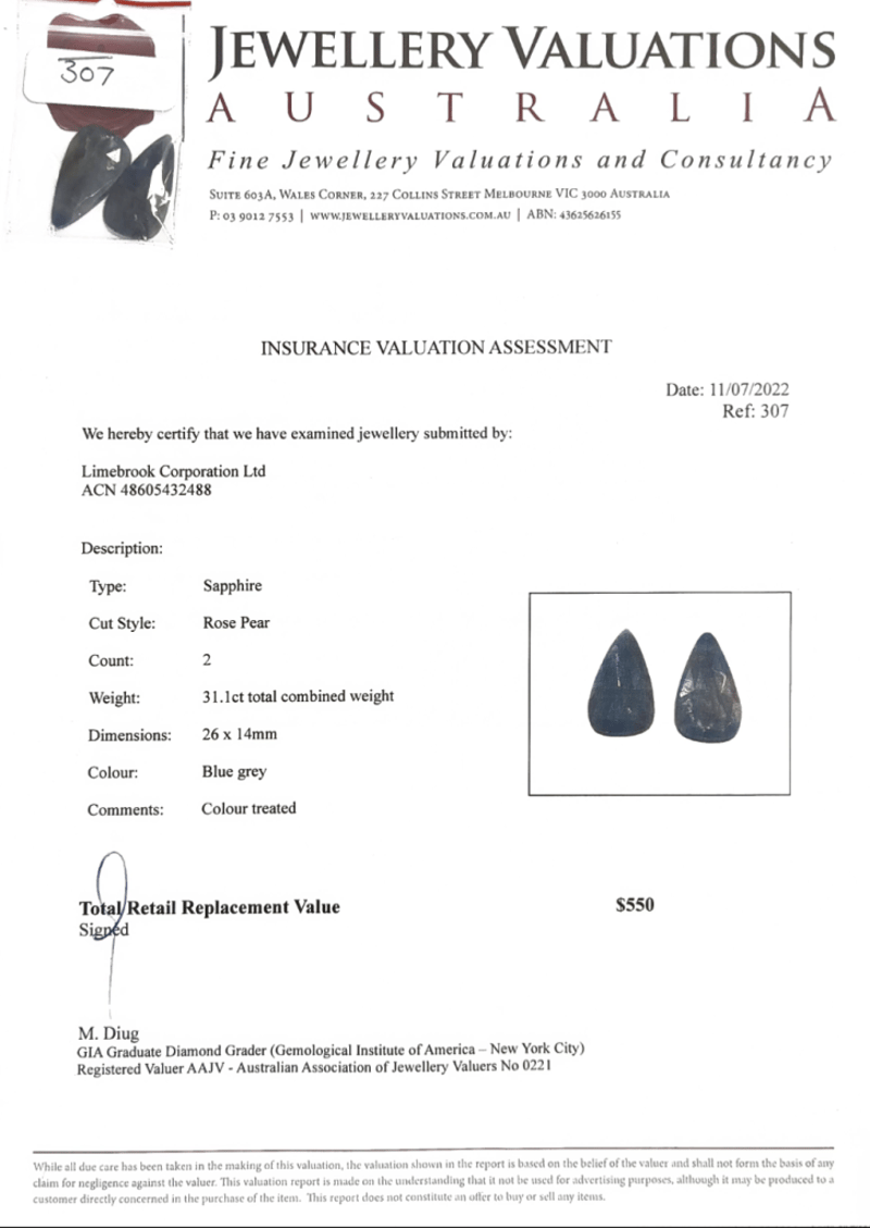 31.1TCW ROSE PEAR SAPPHIRE 2 PCS. ADDITIONAL GIFT CARD $50, OURGIFT2U. Accompanied By Insurance Valuation Assessment And $50 Gift Card, Ourgift2U. Colour: Blue Grey. Comments: Colour Treated. Dimensions: 26 X 14Mm Condition: Good - Refer To Images This valuation has been conducted by an independent third-party professional. The valuation amount is an assessment by the issuing valuer and does not reflect the auction value of the item. Any inquiries regarding the valuation should be directed to the issuing valuer (refer to contact details on the certificate), as Lloyds Auctions has no affiliation or influence over the valuation, the valuer, or the stated amount. Insurance Replacement Valuation Amount: $550.00 FC 162991+26