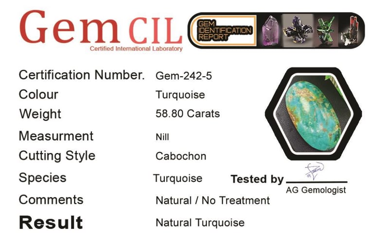 58.80 CARATS NATURAL QUALITY TURQUOISE 58.80 Carats Natural Quality Turquoise Stone = Natural TurquoiseWeight = 58.80 Carats Cut = Cabochon Colour = TurquoiseQuantity = 1Note = Gem Cil, Certified, Condition: Good - Refer Images 0488573+5