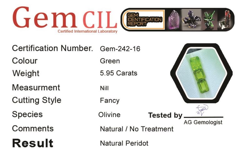 5.95 CARATS NATURAL LUSTROUS PERIDOT 5.95 Carats Natural Lustrous PeridotStone = Natural PeridotWeight = 5.95 CaratsColour = Green Cut = Fancy Note = Gem Cil, Certified, Precise Custom Cut (Not Commercial) Condition: Good - Refer Images 0488573+16