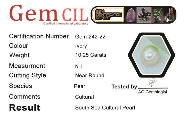 10.25 CARATS SOUTH SEA PEARL 10.25 Carats South Sea Pearl Stone = South Sea Pearl Weight = 10.25 Carats Treatment = CulturalQuantity = 1Note = Gem Cil, Certified, Condition: Good - Refer Images 0488573+22