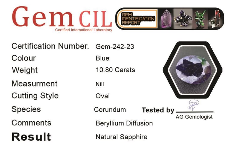 10.80 CARATS NATURAL CERTIFIED SAPPHIRE 10.80 Carats Natural Certified Sapphire Stone = Natural SapphireWeight = 10.80 Carats Cut = Oval Colour = BlueLustre = ExcellentTreatment = Beryllium Diffusion Note = Gem Cil, Certified, Precise Custom Cut (Not Commercial) Condition: Good - Refer Images 0488573+23