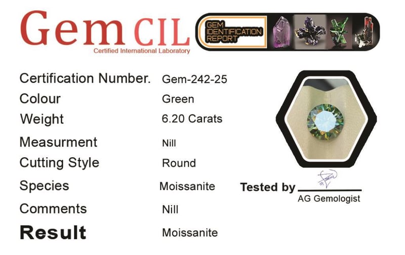 6.20 CARATS SPARKLING MOISSANITE 6.20 Carats Sparkling MoissaniteStone = MoissaniteWeight = 6.20 Carats Colour = GreenCut = RoundLustre = ExcellentNote = Gem Cil, Certified, Condition: Good - Refer Images 0488573+25