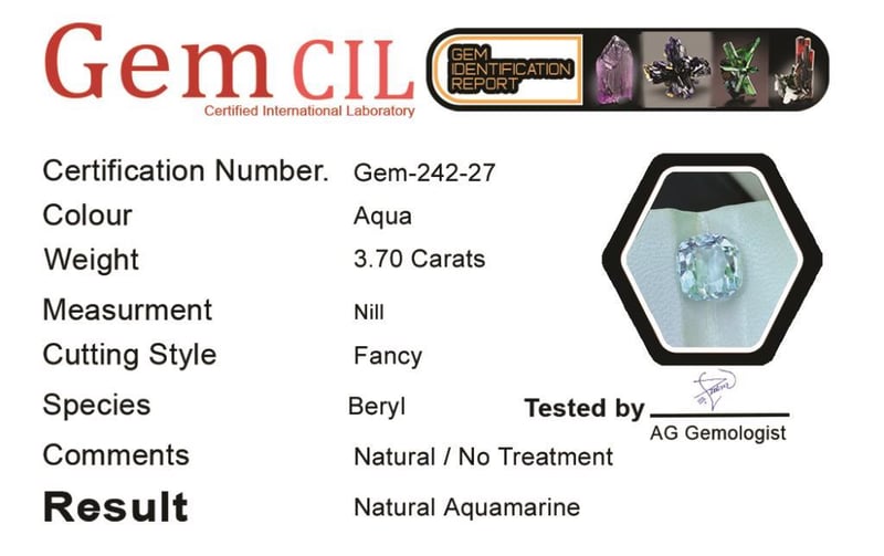 3.70 CARATS NATURAL QUALITY AQUAMARINE 3.70 Carats Natural Quality AquamarineStone = Natural AquamarineWeight = 3.70 CaratsTreatment = Natural/ No Treatment Detected Colour = AquaCut = Fancy Lustre = ExcellentNote = Gem Cil, Certified, Precise Custom Cut (Not Commercial) Condition: Good - Refer Images 0488573+27