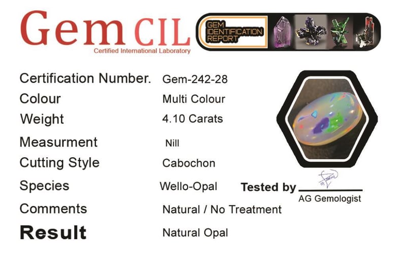 4.10 CARATS NATURAL FIERY WELLO OPAL 4.10 Carats Natural Fiery Wello OpalStone = Natural OpalWeight = 4.10 Carats Colour = Multi ColourCut = Cabochon Treatment = Natural, No TreatmentNote = Gem Cil, Certified Pic Taken Under Light Condition: Good - Refer Images 0488573+28