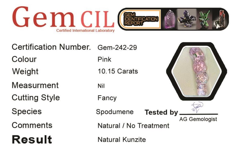 10.15 CARATS NATURAL KUNZITE 10.15 Carats Natural Kunzite Stone = Natural KunziteWeight = 10.15 Carats Colour = PinkCut = Fancy Lustre = ExcellentNote = Gem Cil, Certified, Precise Custom Cut (Not Commercial) Condition: Good - Refer Images 0488573+29