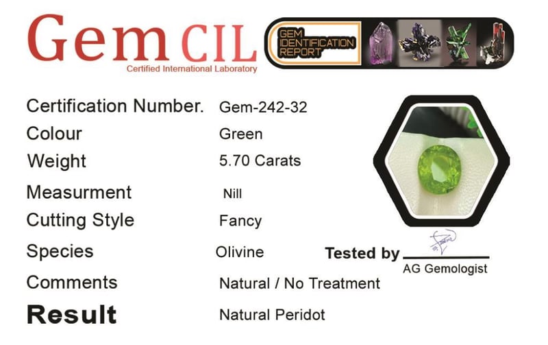 5.70 CARATS NATURAL LUSTROUS PERIDOT 5.70 Carats Natural Lustrous PeridotStone = Natural PeridotWeight = 5.70 CaratsColour = Green Cut = Fancy Note = Gem Cil, Certified, Precise Custom Cut (Not Commercial) Condition: Good - Refer Images 0488573+32