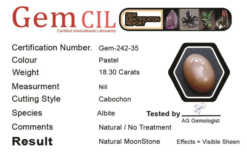 18.30 CARATS NATURAL MOONSTONE 18.30 Carats Natural MoonstoneStone = Natural MoonstoneWeight = 18.30 Carats Colour = Pastel Cut = Cabochon Lustre = ExcellentEffect = Nice Visible SheenNote = Picture Taken Under Light Gem Cil, Certified, Condition: Good - Refer Images 0488573+35